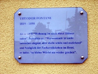 Als er 1870 "Wohnung im alten Hotel Hübner nahm", bemerkte er: "Warnemünde ist nicht besonders elegant, aber darin schön und anziehend" und bezüglich der Zuckerstückchen im Hotel, er habe: "so kleine Würfel nie wieder gesehen".